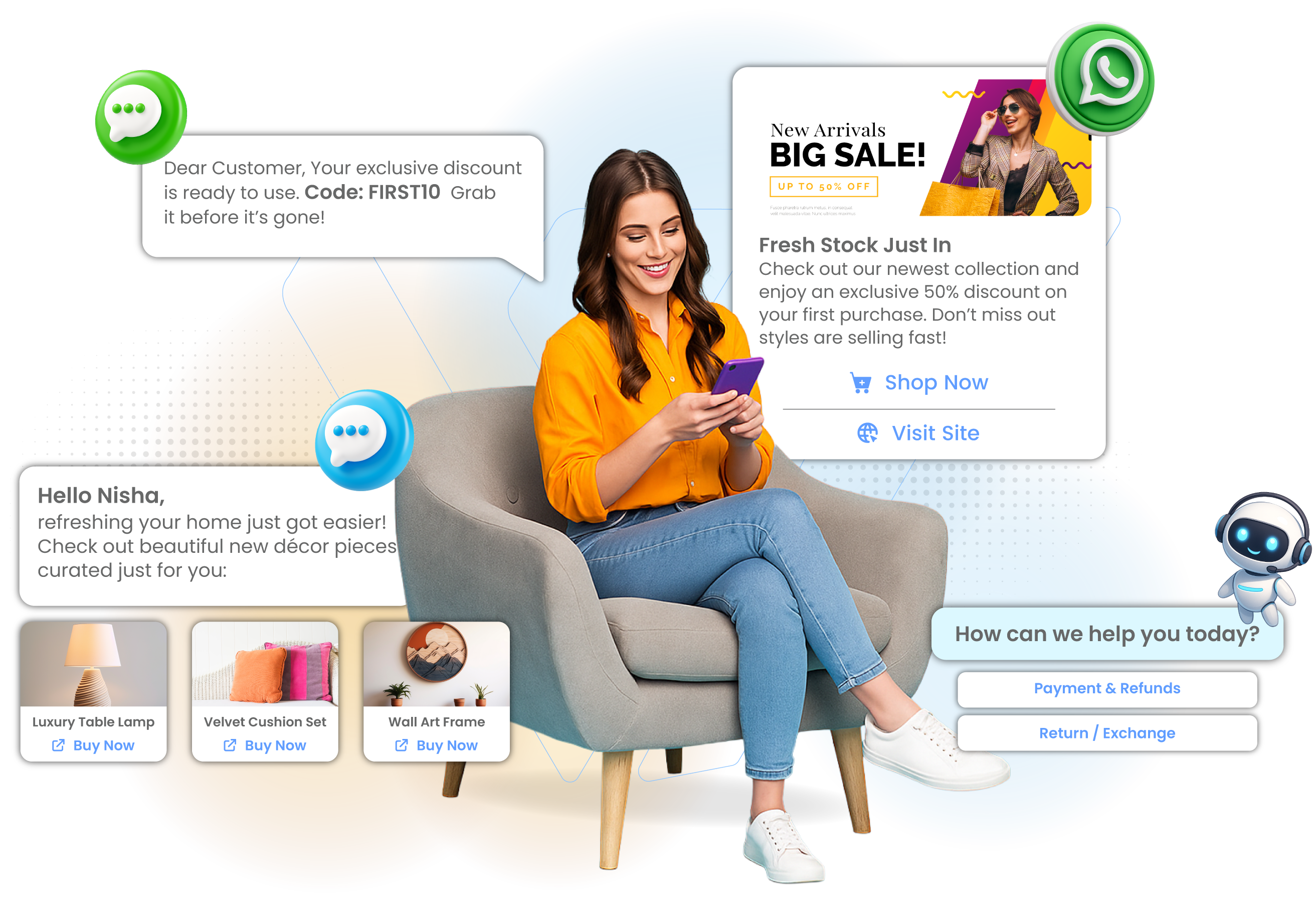 Build intelligent WhatsApp, RCS, and Web chatbots that automate conversations, handle queries instantly, and boost customer engagement 24/7 without human dependency.